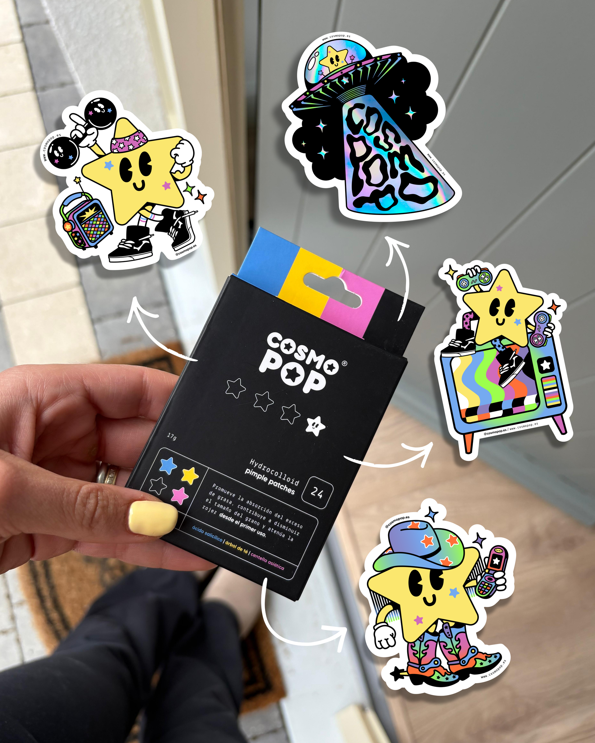 Cosmopop® hydrocolloid pimple patches son parches hidrocoloides en forma de estrella diseñados para tratar granitos puntuales y espinillas de forma efectiva y divertida.